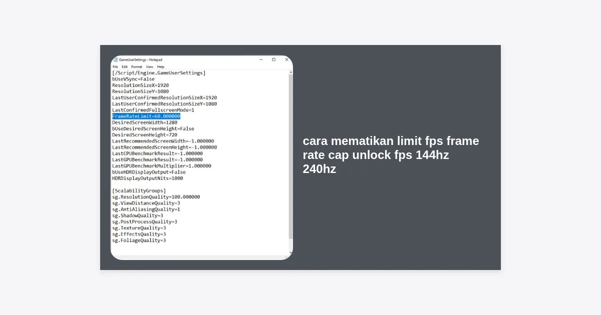 • Cari baris yang bertuliskan FrameRateLimit=. Biasanya nilainya adalah 60.000000.